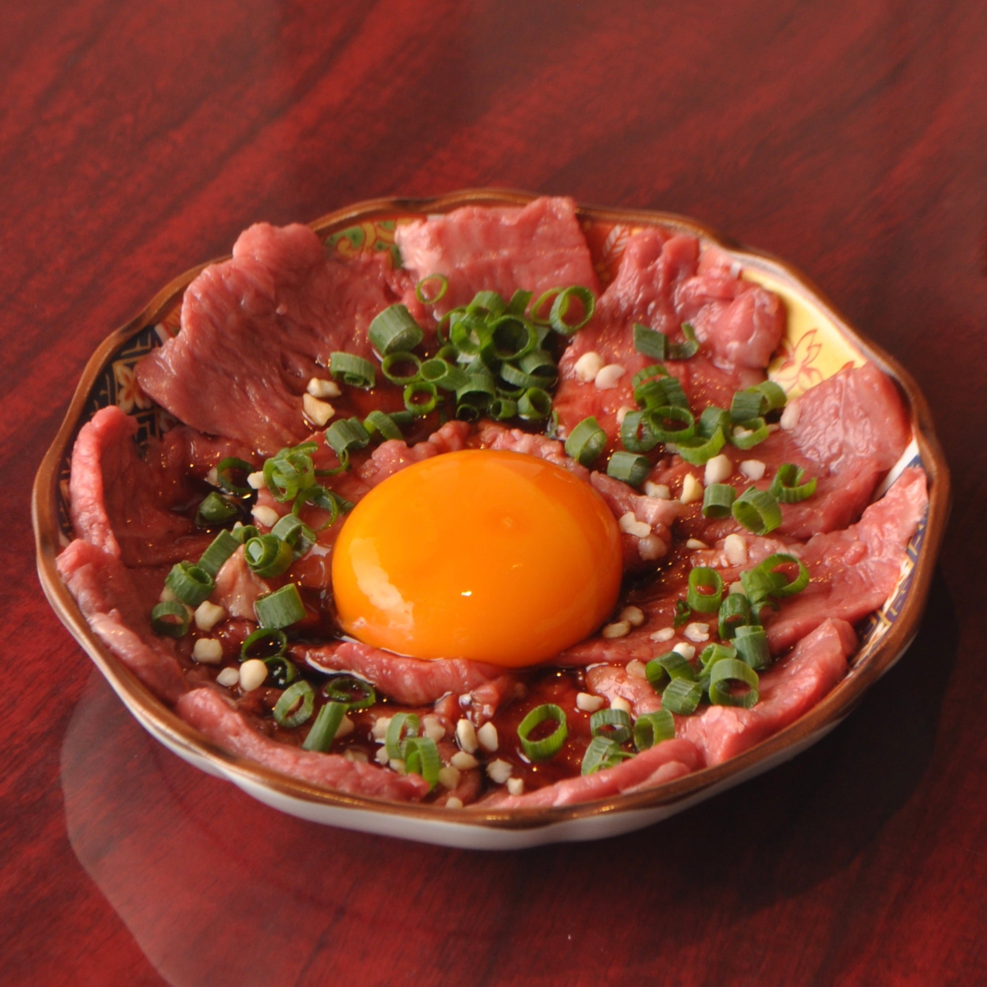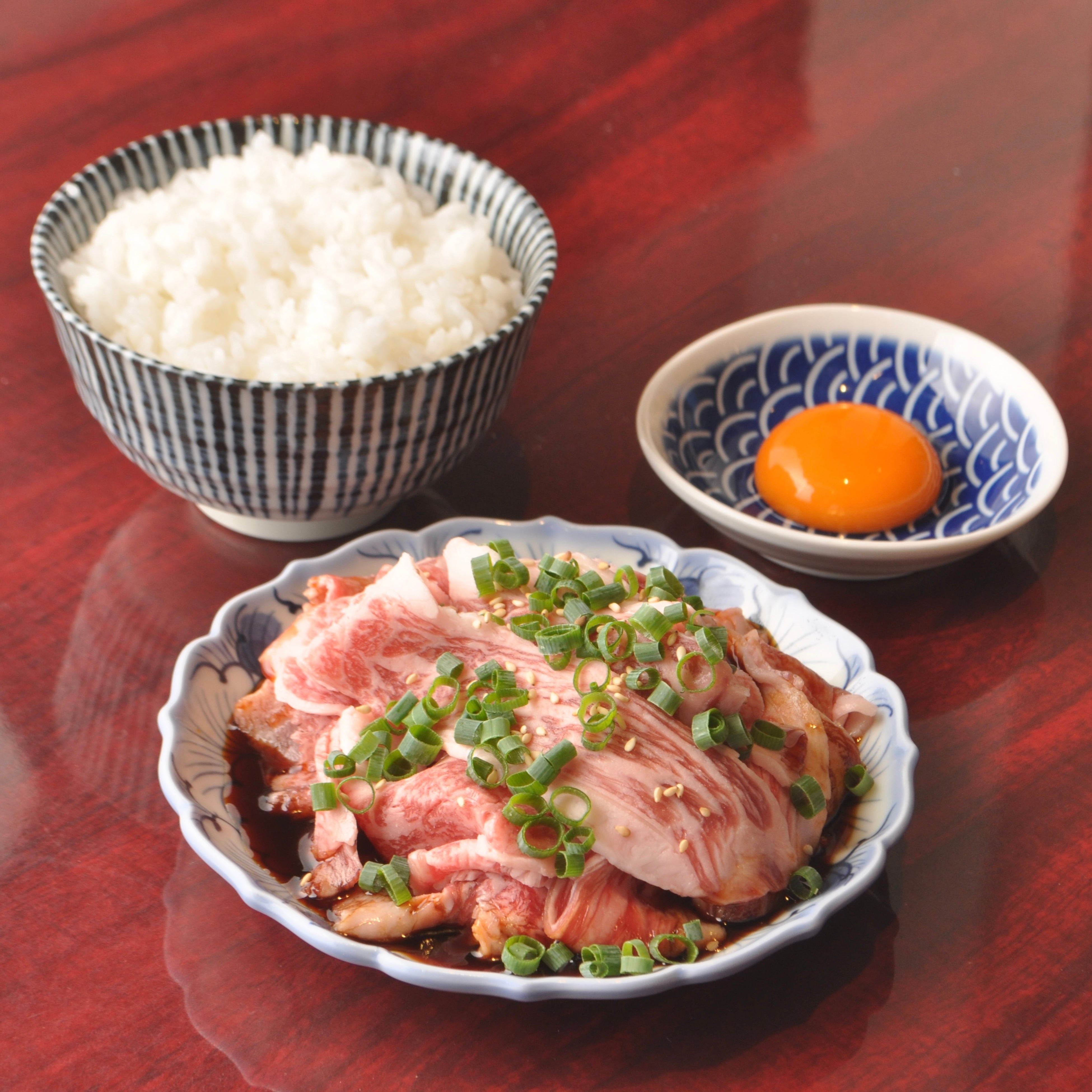 脂ののった旨味の強い部位を薄くスライスし、特製のタレに絡めて焼いていただきます。 さっと火を通して、お肉の油がとろっと溶け出したらご飯へ!豪快にお肉をのせたら、卵黄と一緒にお召し上がりください。スライスされたお肉は白ご飯と相性抜群です。是非最後の〆にご注文ください。