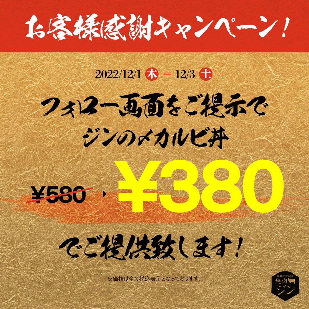 12月1日(木)より3日間フォロワー限定で「ジンの〆カルビ丼」を¥380でご提供いたします!