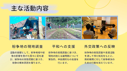具体的には、紛争地域のファクト・ファインディング(紛争の根本原因と実態の把握)、ファクト・ファインディングにもとづいた平和への支援、紛争地での支援活動の経験を外交政策に繁栄させたことなどが挙げられます。直近では、カンボジアやミャンマーでの活動に当たって学生を主導としたクラウドファンディングなどにも挑戦しきました。