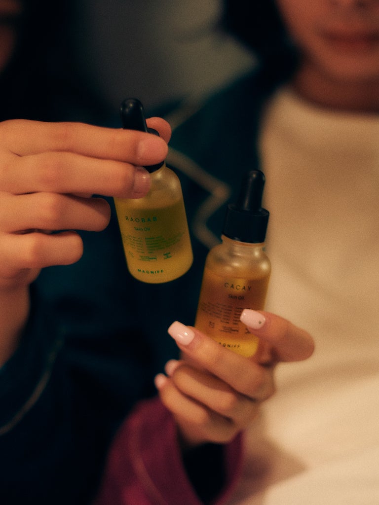 MAGNIFFの「スキンオイル」はバオバブ・カカイという希少な植物それぞれの種子からじっくりと非加熱・低温で圧搾したオイル*¹を用いた美容オイル。原料に含まれる有用成分を破壊することなく、ありのままを抽出しているため、植物オイル*⁴の特性をダイレクトに感じられる製品です。おすすめは洗顔後のブースターオイルとしての使用。他にも、乳液やクリーム代わりの保湿としても、さらには髪や体にも使用可能で、シンプルな製品内容であるがゆえにマルチユースなアイテムとなっています。