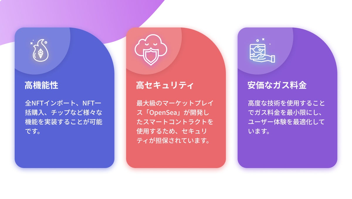 さらにOpenSeaと同様のスマートコントラクトを使用しているため、高セキュリティかつ、OpenSea同様の機能を実装することが可能です。