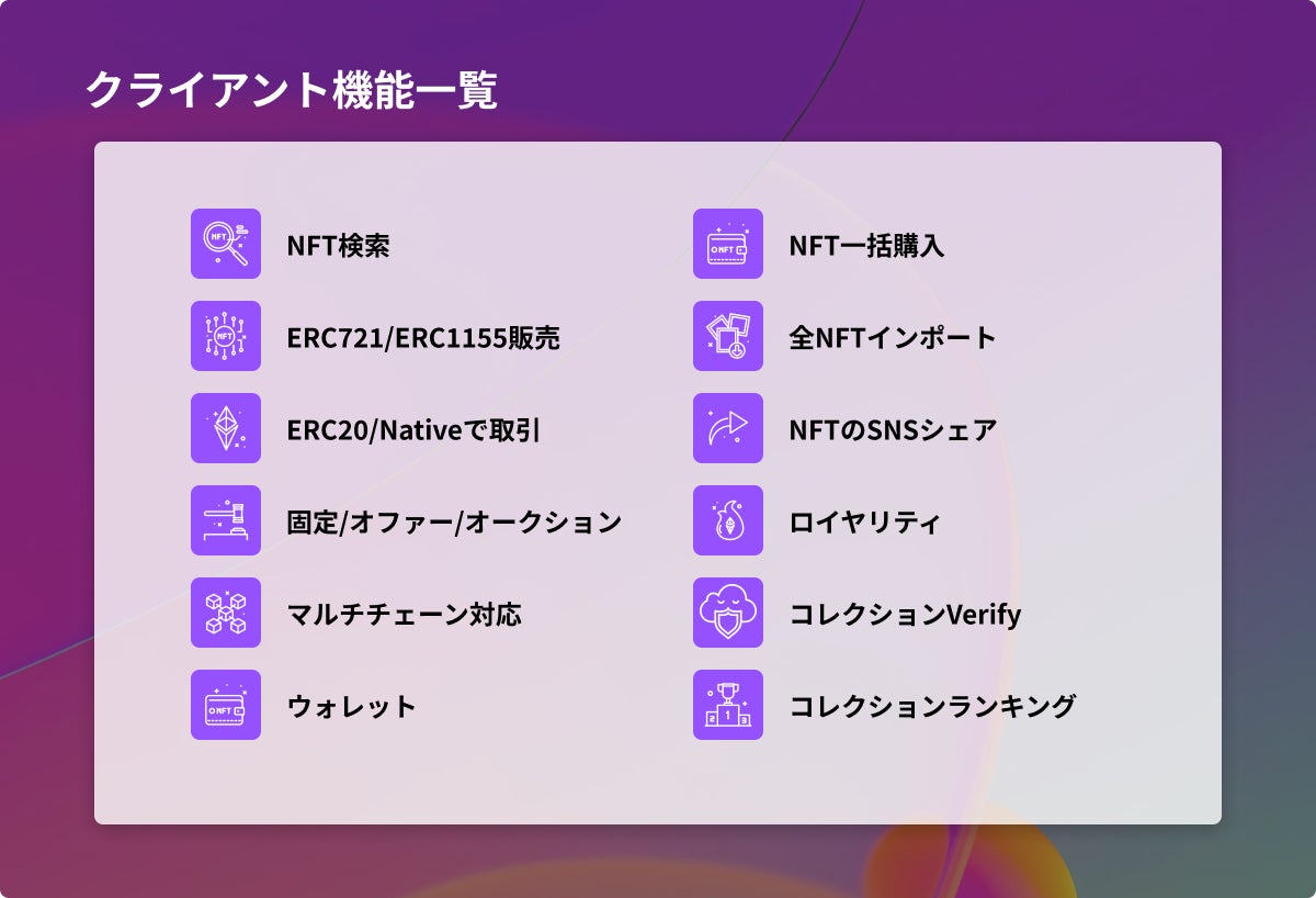 パッケージを使用して開発することで、低価格かつ高機能なNFTマーケットプレイスをスピーディーに展開することが可能です。