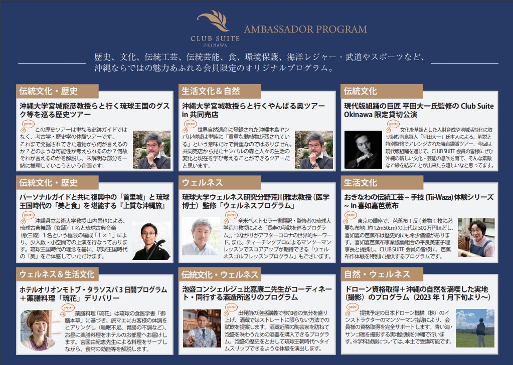 さらに、プログラム内では滞在前・滞在中に会員の方のサポートを行う「エグゼクティブ・アシスタントサービス」や、沖縄の歴史や文化、自然を体験する本プログラム限定のアクティビティ「会員専用アンバサダープログラム」をご用意。長期滞在ならではの、新たな沖縄の楽しみ方をご提案します。