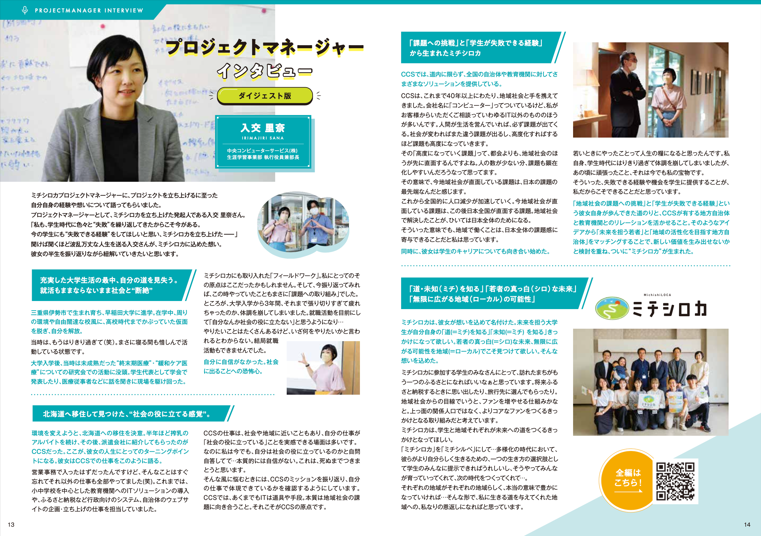 CCSでは、地域が抱える課題や魅力と向き合い、体験する教育プログラム「ミチシロカ」を通じて、今後も新たな地域ICT人材の育成、新しい地域価値の創造を目指してまいります。