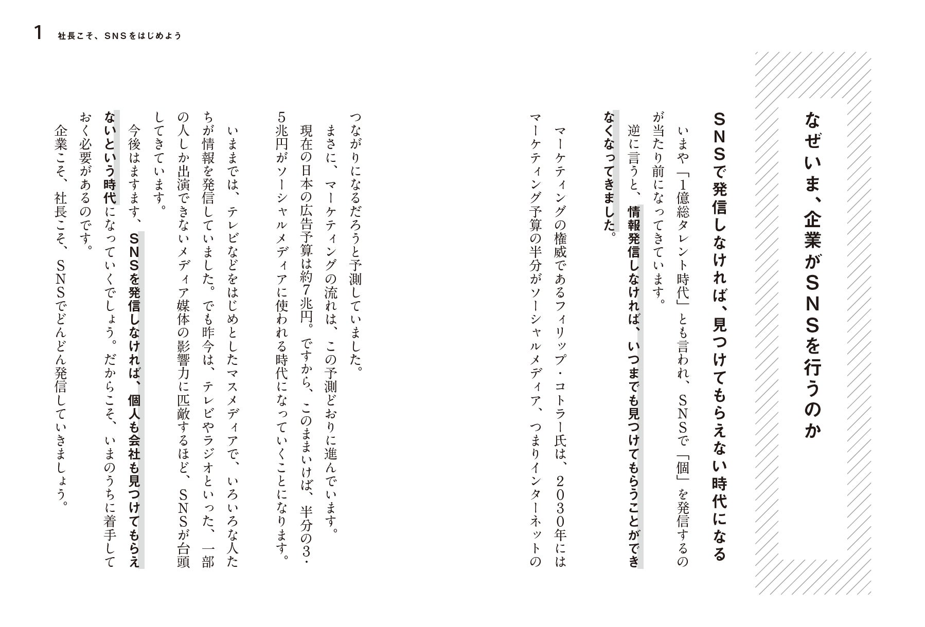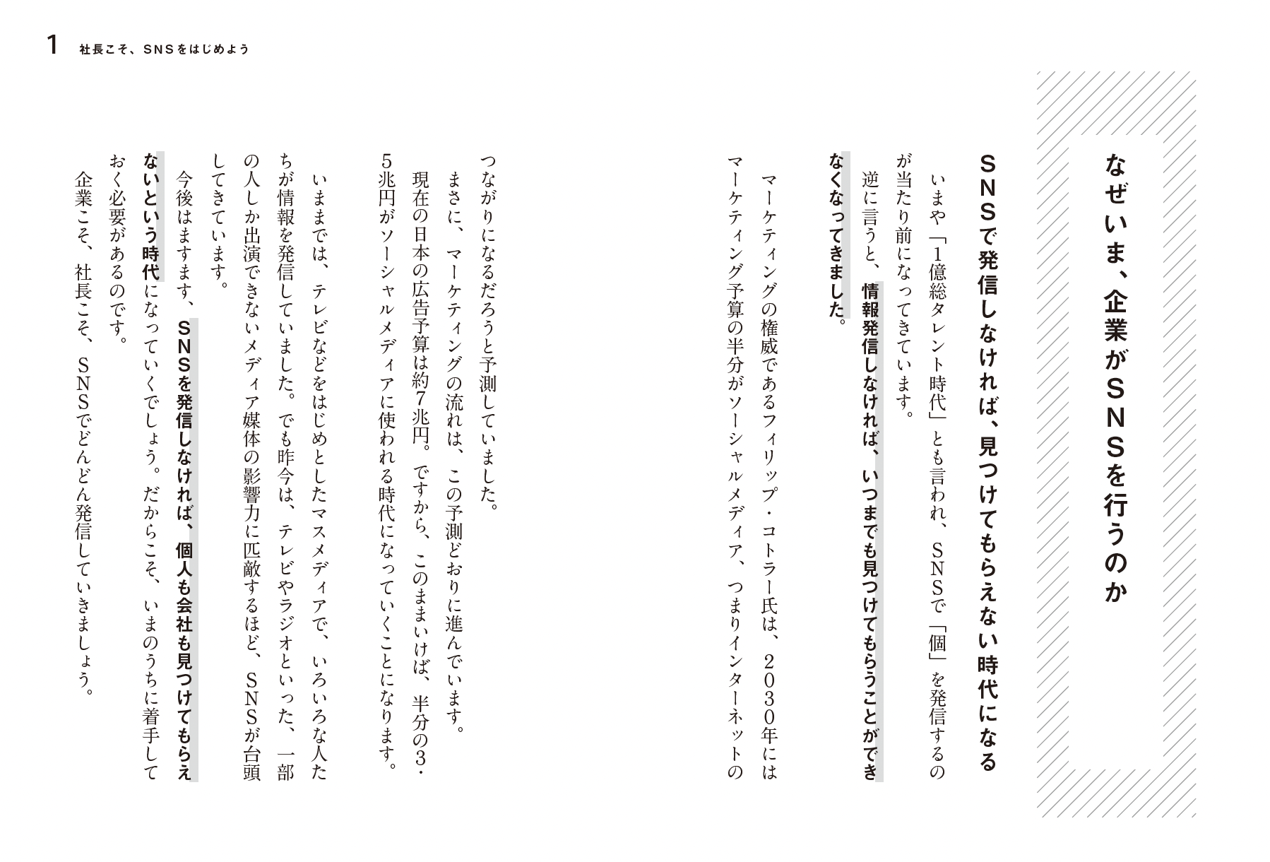 最初の一歩を踏み出せないでいた2年前の自分のような人たちの背中を押したいという著者の願いから、「SNS発信をしても効果が出ず、社員やまわりの経営者にバカにされるかもしれない・・・」「今更若い人にこんなことを聞くのは恥ずかしい」 という経営層のSNS初心者向けに、わかりやすく具体的に解説しています。