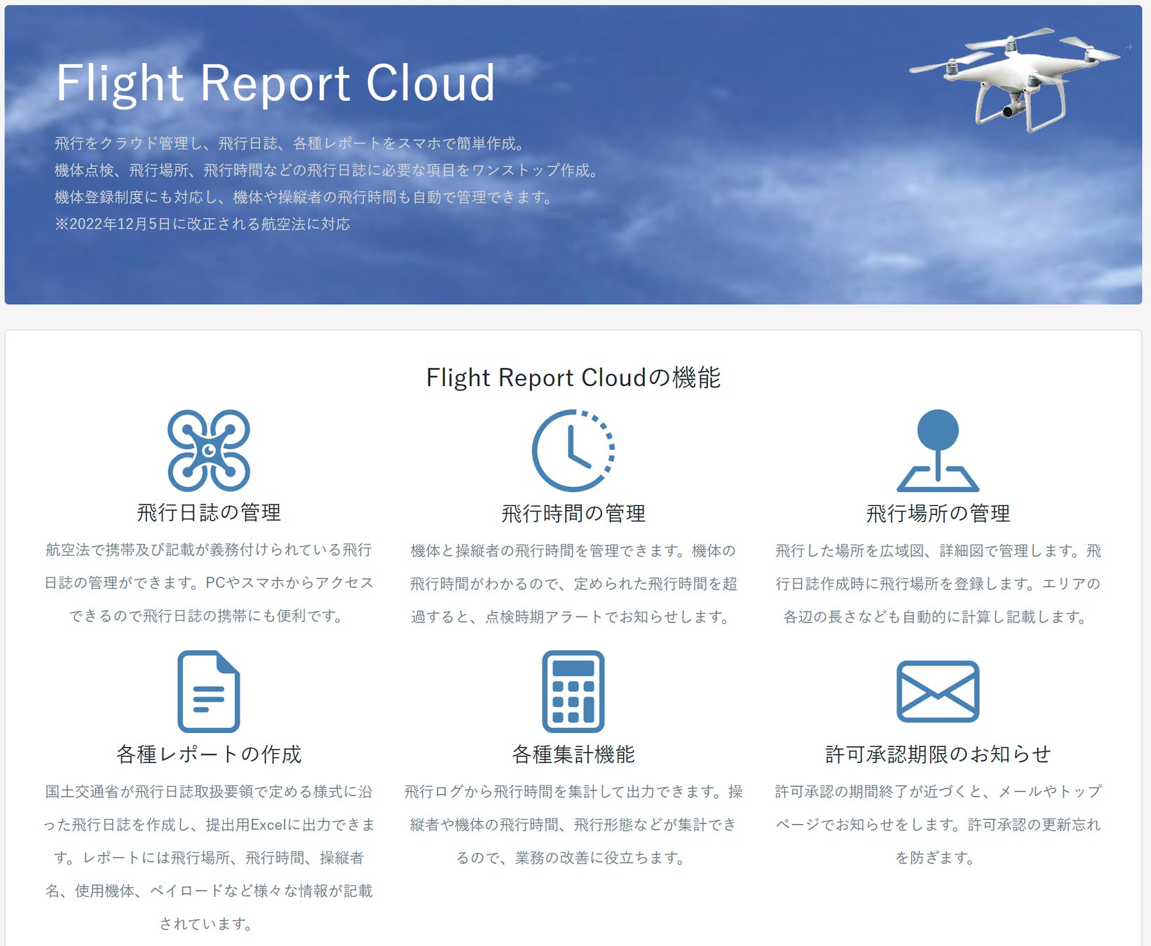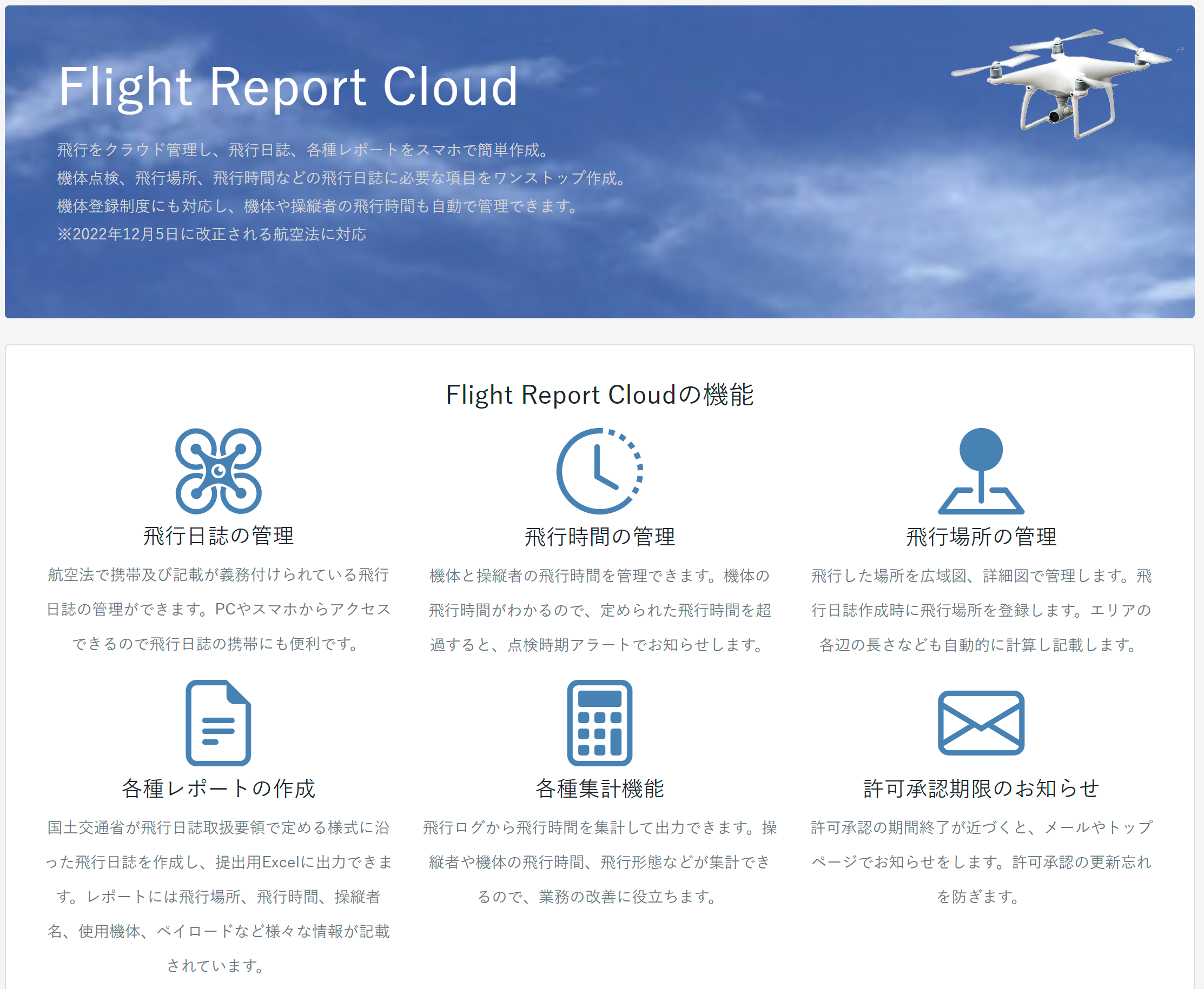 12月5日より改正航空法で義務化される「無人航空機の飛行日誌の取扱要領」に完全対応。ドローン飛行管理アプリ『Flight Report Cloud(フライトレポートクラウド)』サービス開始。