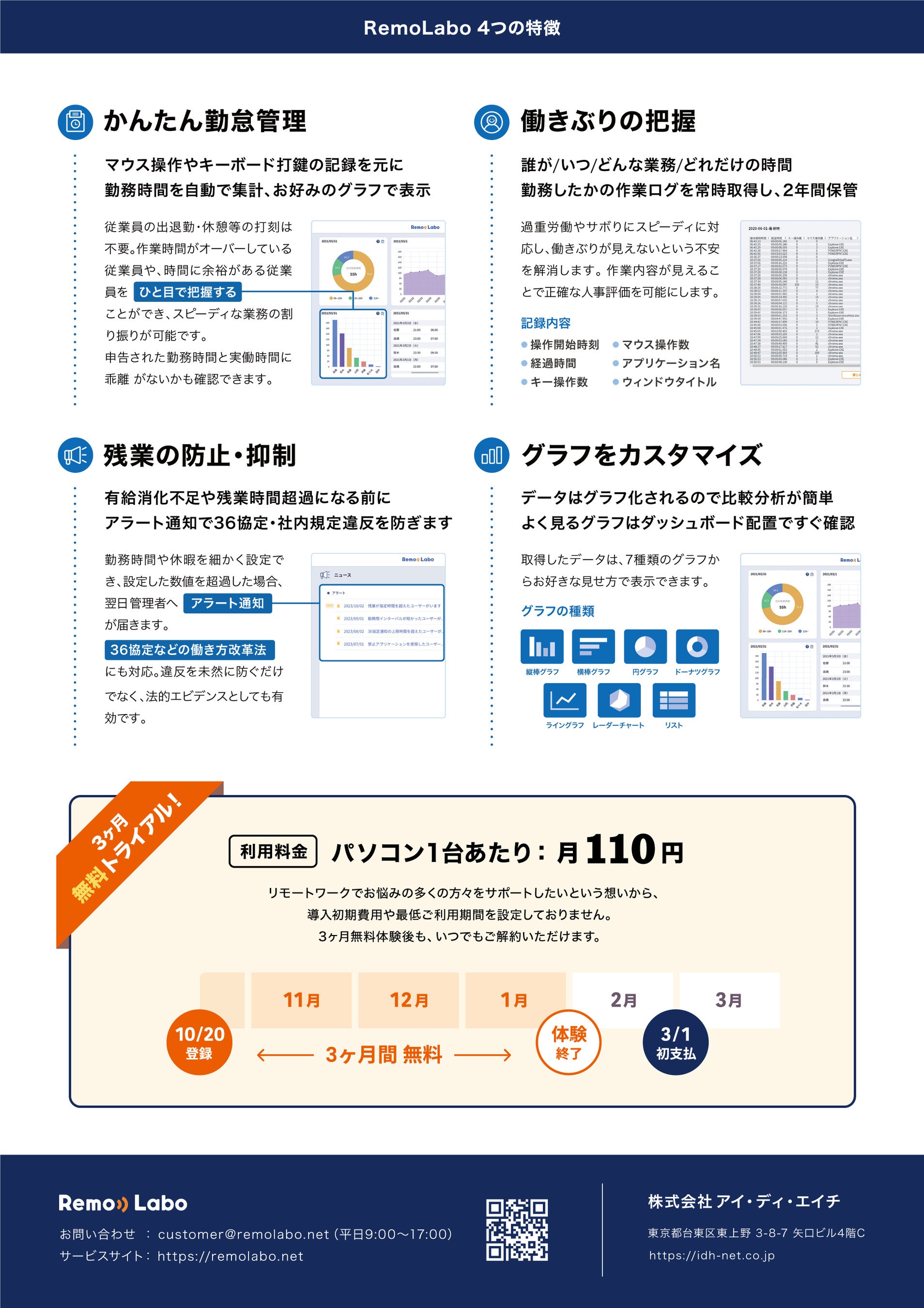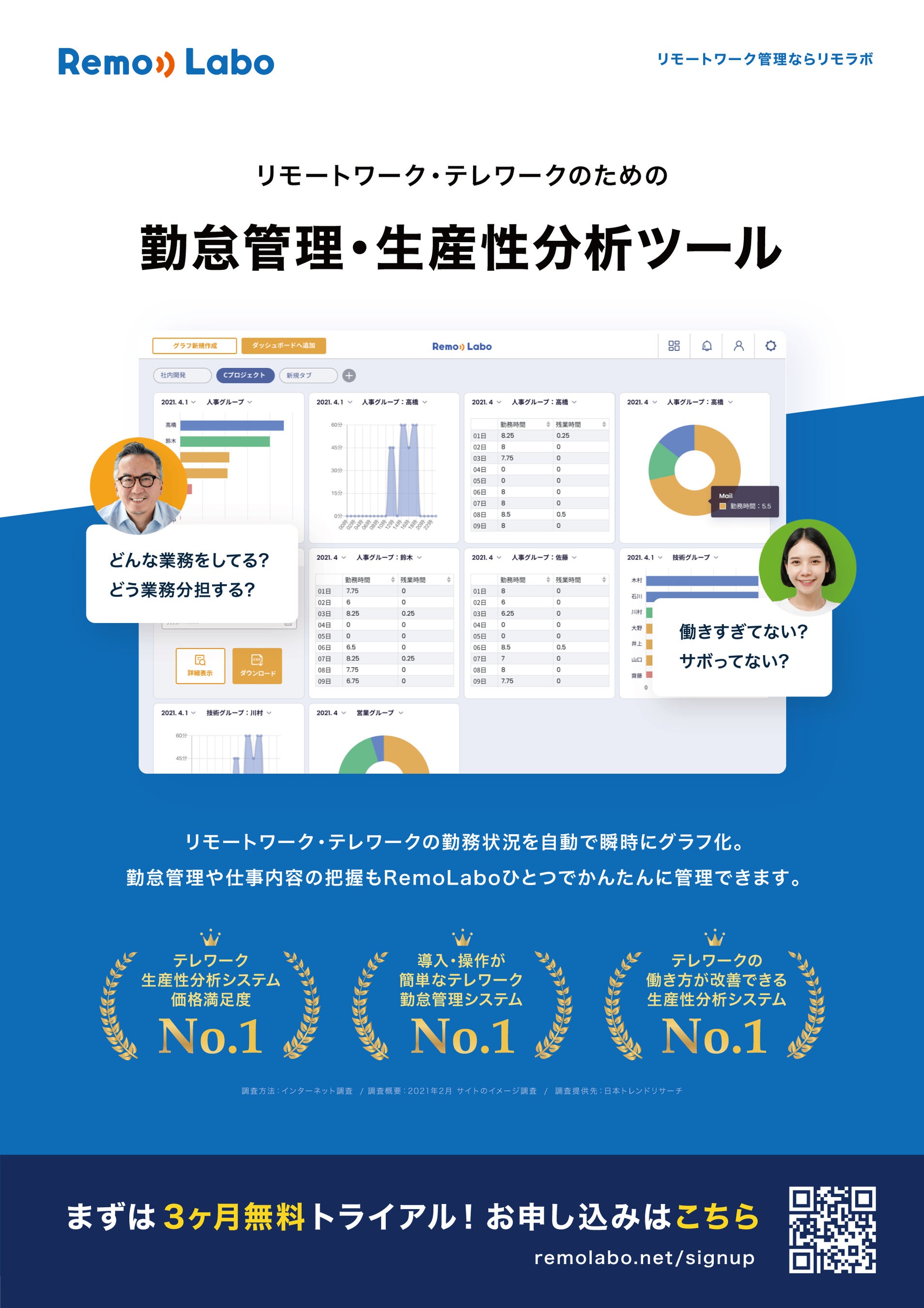「RemoLabo」は各PCにインストールするだけで、一人ひとりの稼働時間や勤務間インターバル、作業毎の所要時間など、管理者が把握したい情報をグラフやマップで可視化するため従業員の管理を一元化することができます。また、企業や管理者によってグラフやマップの内容を柔軟にカスタマイズできる点も特徴の一つです。