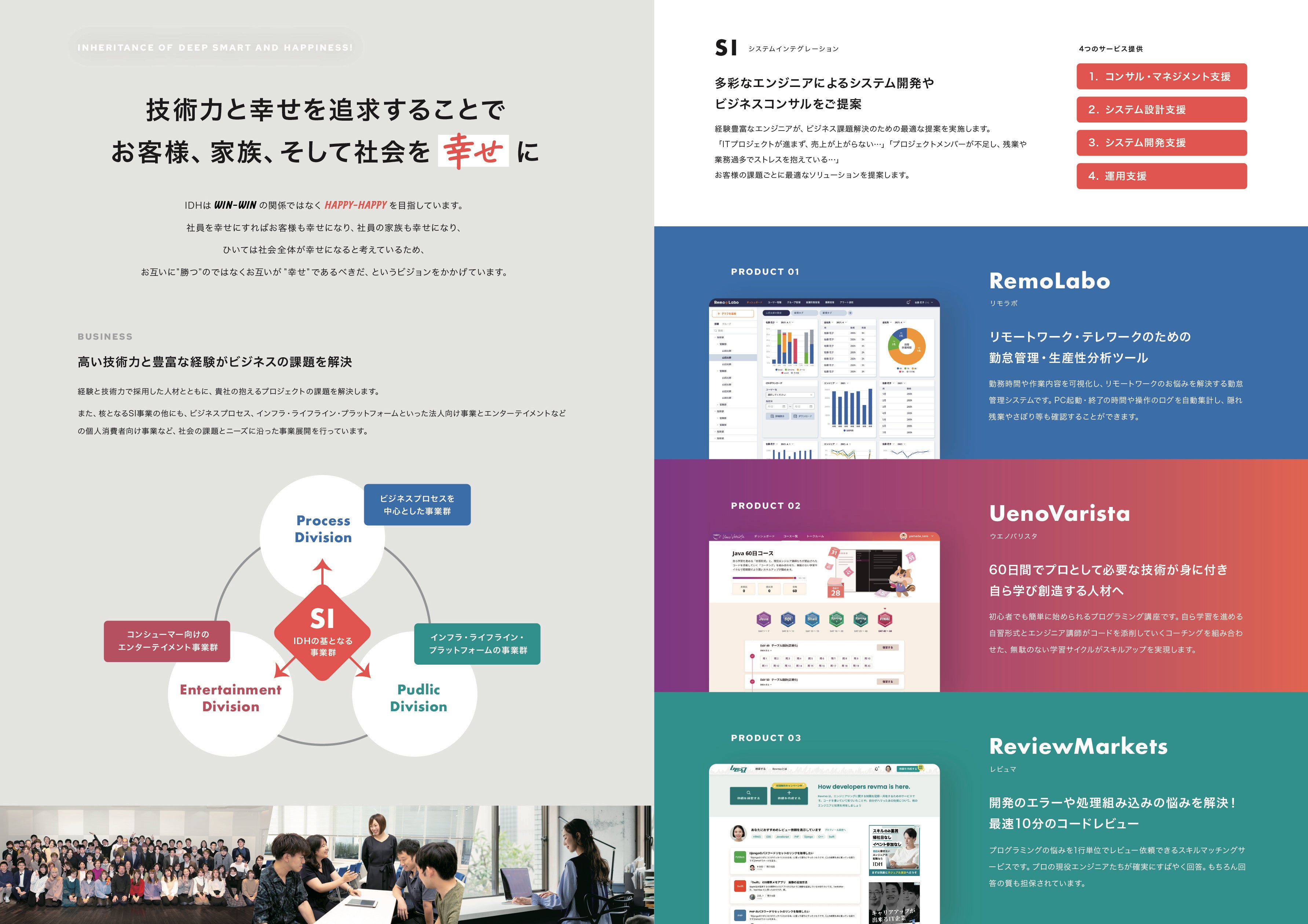 設立10年目を迎え、より多くの方に弊社IDHの優秀なエンジニアやシステム開発力、リモートワーク支援サービスやプログラミング教育ツールなどを知っていただき、事業推進に活用いただきたく、初めてオフラインの展示会に参加するに至りました。ブース内ではシステムインテグレーション、SES事業や、リモートワーク支援サービス「RemoLabo」、プログラミング教育ツール「UenoVarista」、コードレビューサイト「ReviewMarkets」など自社サービスを中心にご紹介いたします。