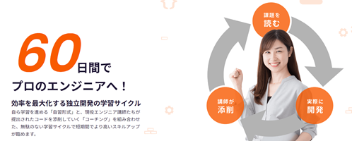 UenoVaristaは、環境構築不要で初心者でも簡単に始められるオンラインプログラミング講座です。プロのエンジニアによるコード添削が受けられ、未経験でもエンジニア3年目相当の実力に就職保証付きなのでカリキュラム終了後すぐにエンジニアデビューが可能です。IT人材の育成やリスキリングにも活用いただくことができます。
