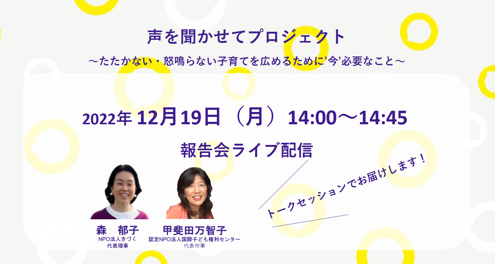 当日は、ヒアリングによって集めたリアルな養育者の声と、そこから見えてきた、子育てに今求められていることを、NPO法人きづく代表理事 森 郁子と認定NPO法人国際子ども権利センター(C-rights シーライツ)代表理事 甲斐田万智子のトークセッション形式でご報告させていただきます。