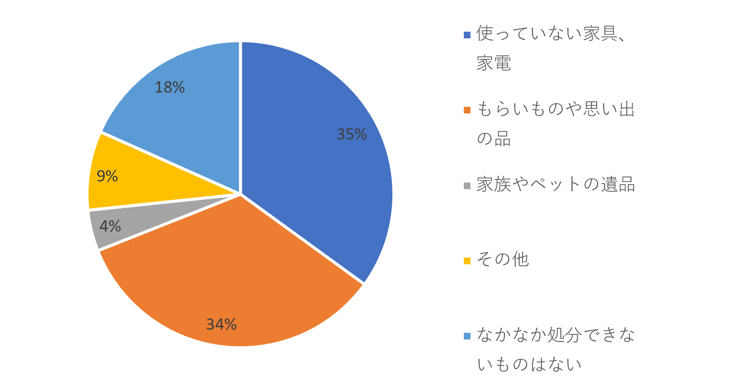 また「なかなか処分できずに家にある不用品はありますか?またそれはどのようなものですか?」という質問については、「使っていない家具、家電」と回答した人が105名、「もらいものや思い出の品」が僅差で102名という結果になりました。