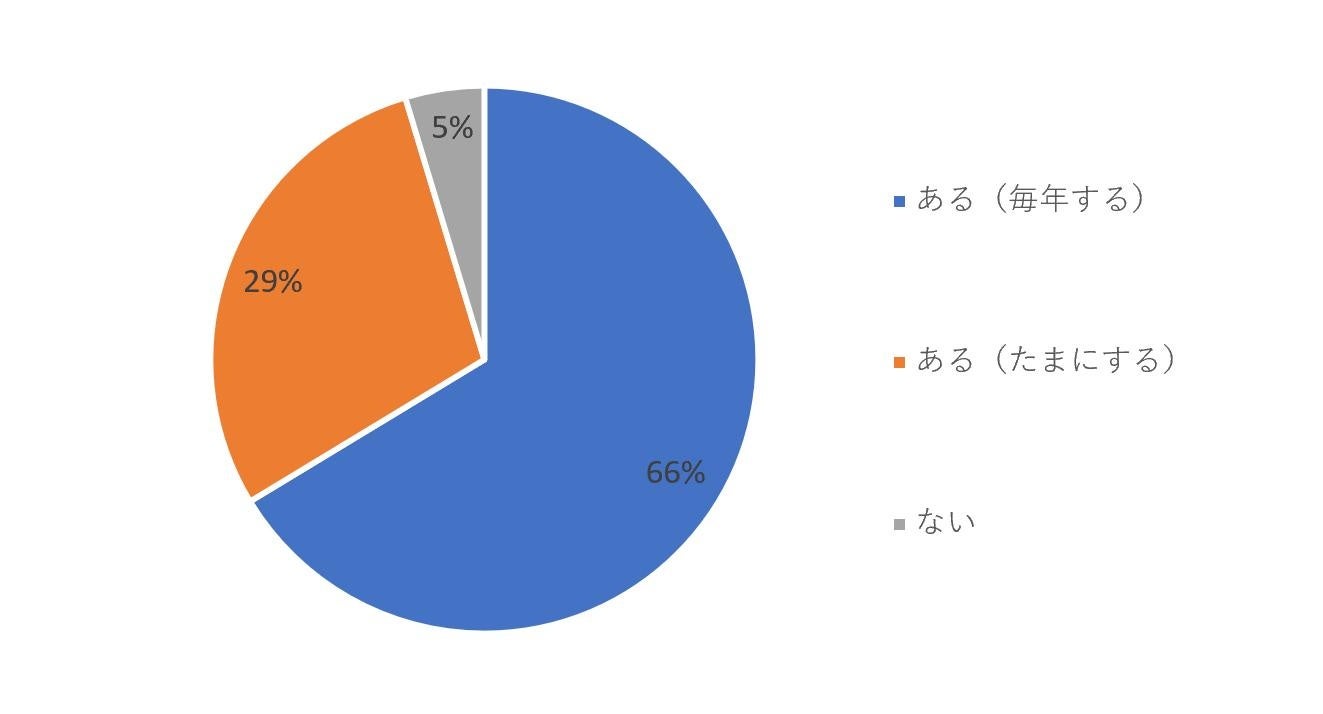 「年末に大掃除を行ったことはありますか?」という質問について、回答者の66パーセントが「ある(毎年する)」と答えました。次いで29パーセントの人が「ある(たまにする)」と回答しているため、合計で95パーセントの人が年末の大掃除を実施していることがわかりました。