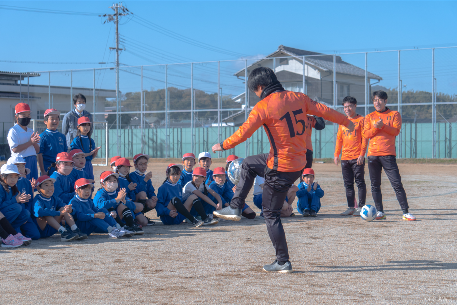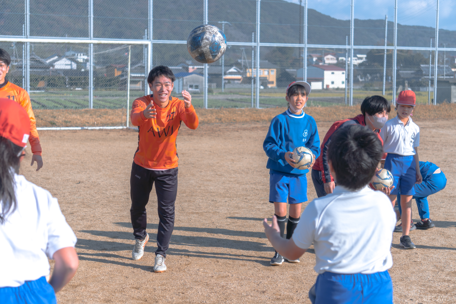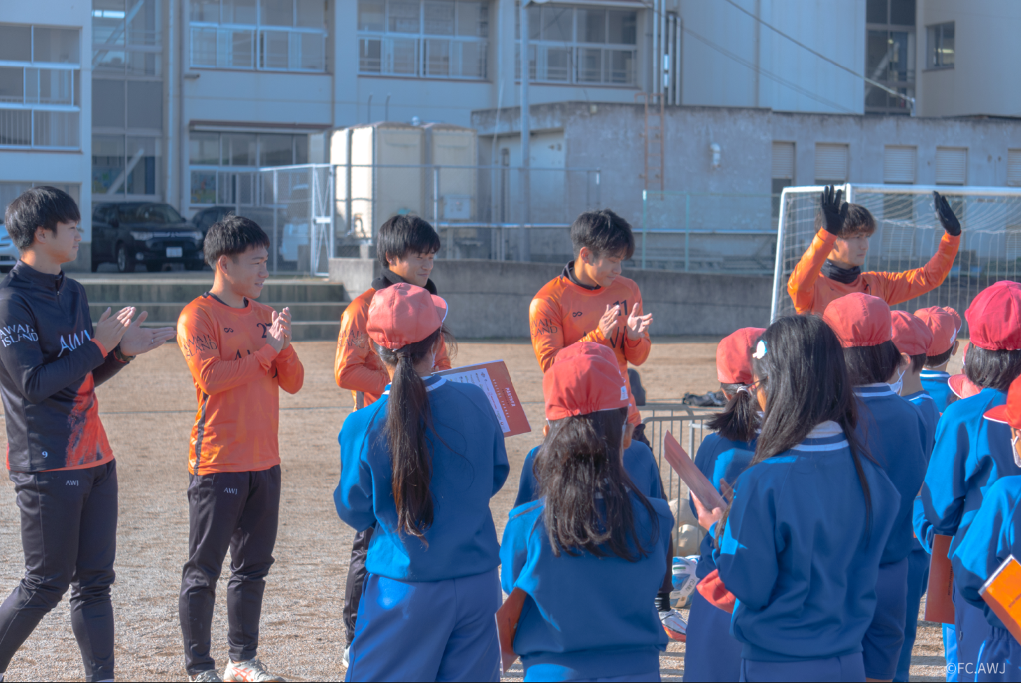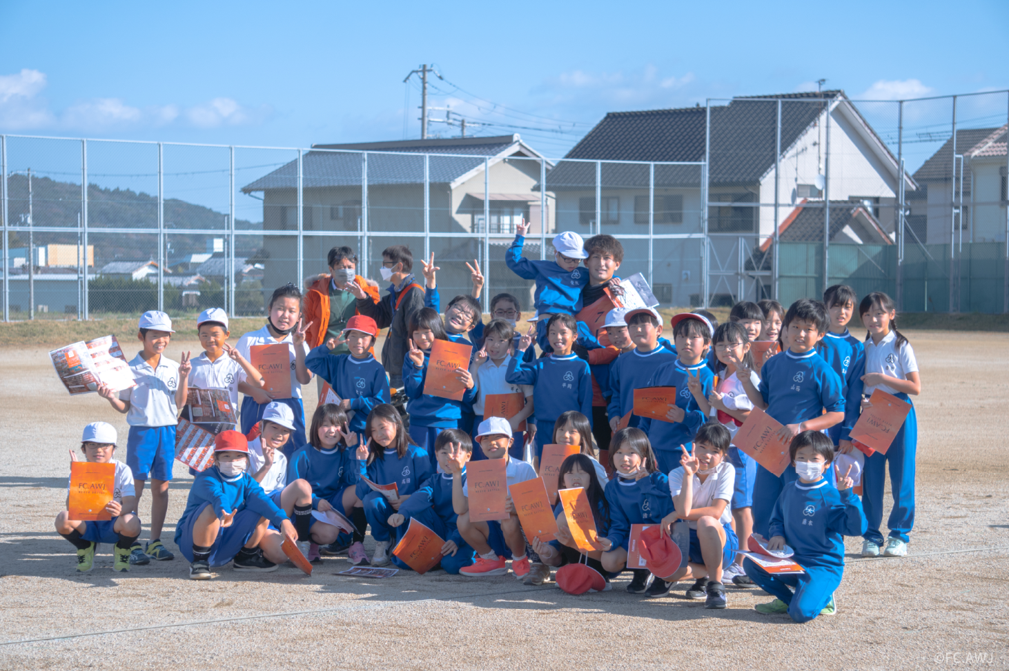 現在関西リーグに所属し淡路島を拠点にJリーグを目指し活し活動しているFC.AWJが地元の洲本市立大野小学校で訪問サッカー体験授業を実施、選手7名が学校を訪問。