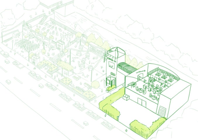 キッチンカーやトレーラーハウスが出店する街のフードコートと、さまざまなイベントが定期的に開催されるオープンスペースです。