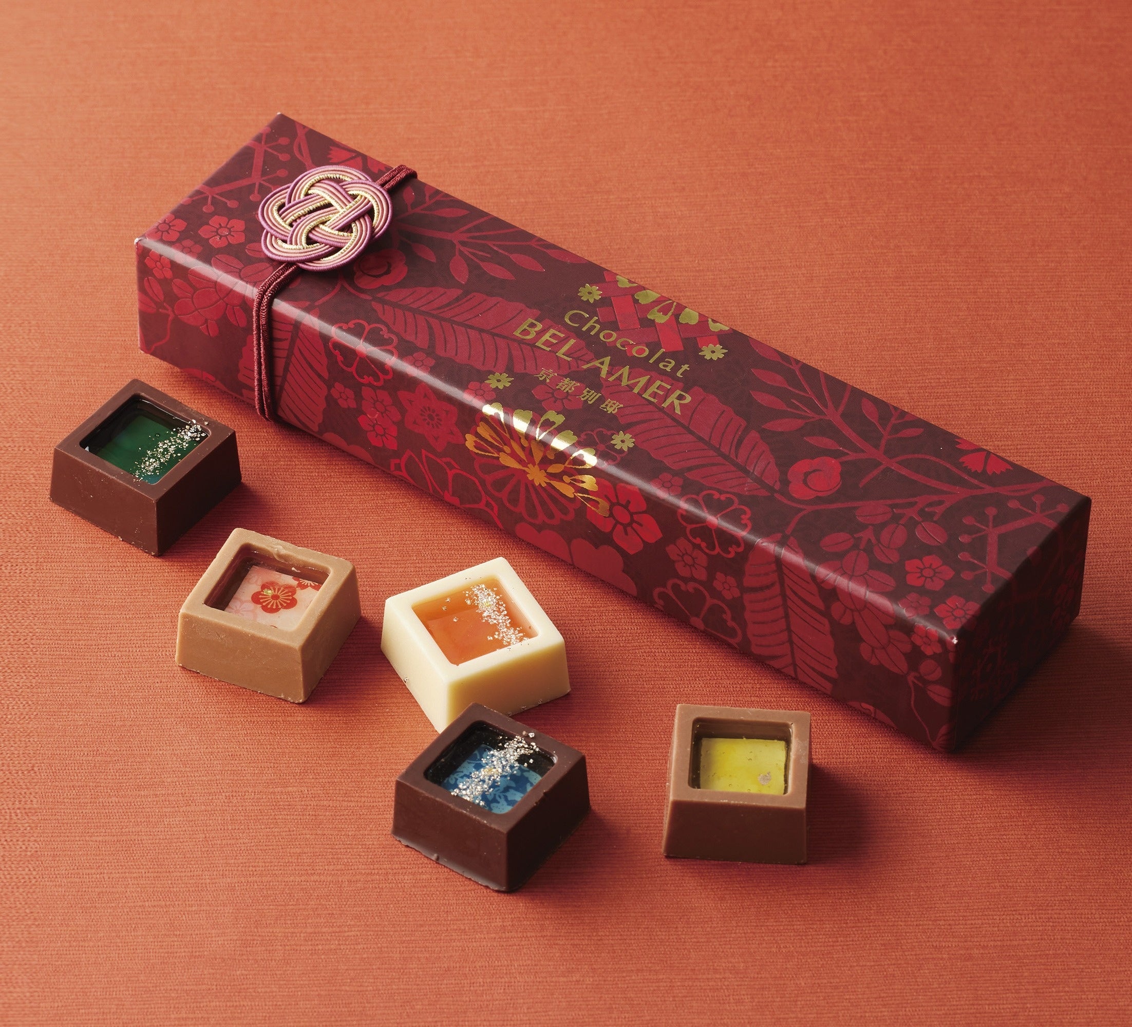 京都の酒米「祝」を使用した、京都の酒造の日本酒ショコラです。枡に見立てたショコラの中に、日本の素材をジュレにして流し込みました。