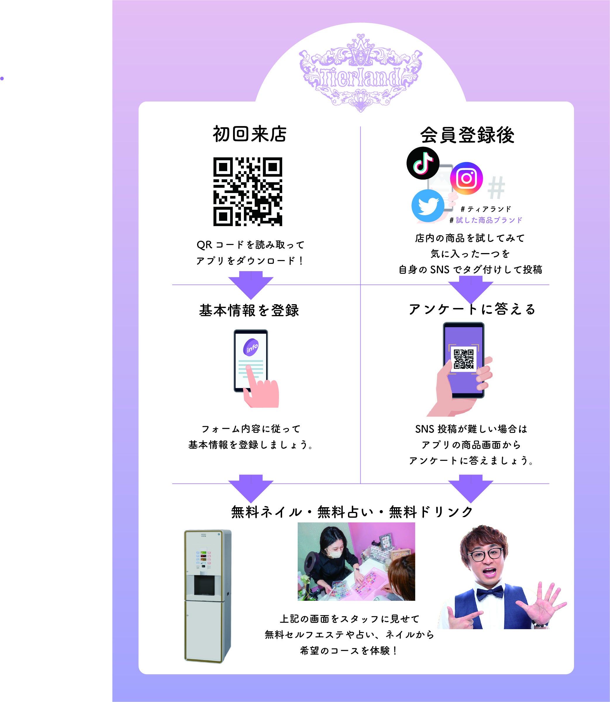 これまでの商品を体験することが中心の店舗ではなく、体験していただくことそのものを重要な価値と考え、体験してレビューするだけで無料でネイルやセルフエステや肌診断機、占い等利用ができるゲーム感覚の美容テーマパークです。