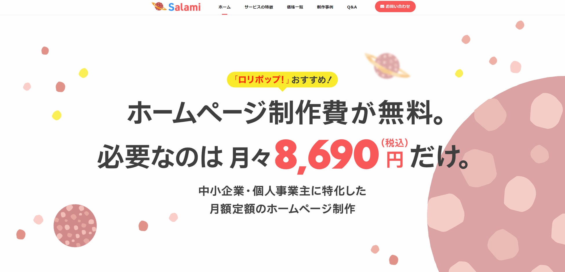 一般的に、制作会社にホームページを外注すると数十万円単位で初期コストがかかります。「Salami」では制作費無料でホームページを制作できます。