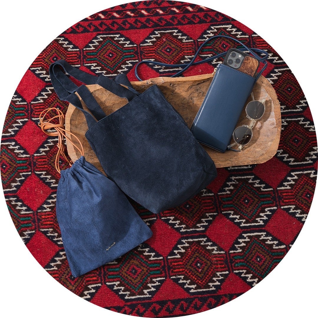 鎌倉・由比ヶ浜近くのアトリエにて、特殊な技法で染められた、虹や夕陽のような美しい色彩が特徴の“グラデーションレザー”による小物やバッグを製作するブランド。使用する革製品は全て、家畜の牛や豚の廃棄になる予定だった革を使用しひとつひとつ手作業によりオリジナルの手法で革を染めています。ピッグスエードを使用したシンプルなkinchaku bag、上質で柔らかいcow leatherを使用したshoulder bag、りんごの廃棄繊維でできたアップルレザーを使用した vegan phone walletの3型を「NAVY」カラーで別注。