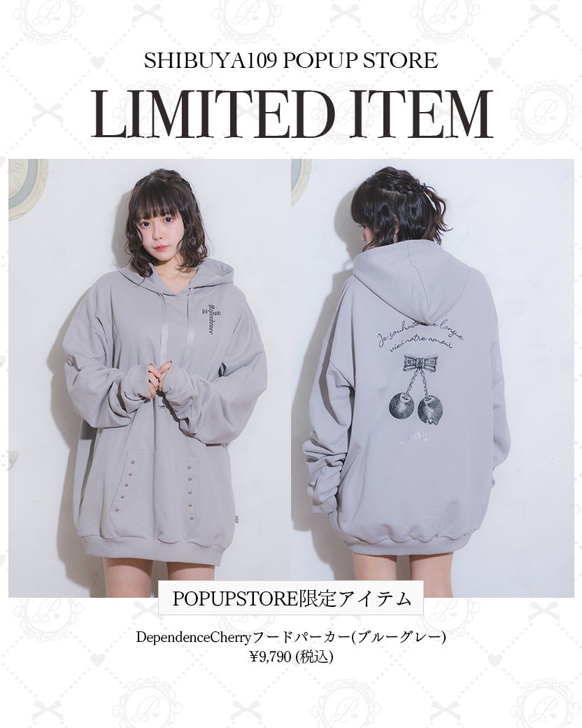 web storeで販売・即完売した「DependenceCherryフードパーカー」の新色「ブルーグレー」をPOPUP STORE限定で販売いたします。