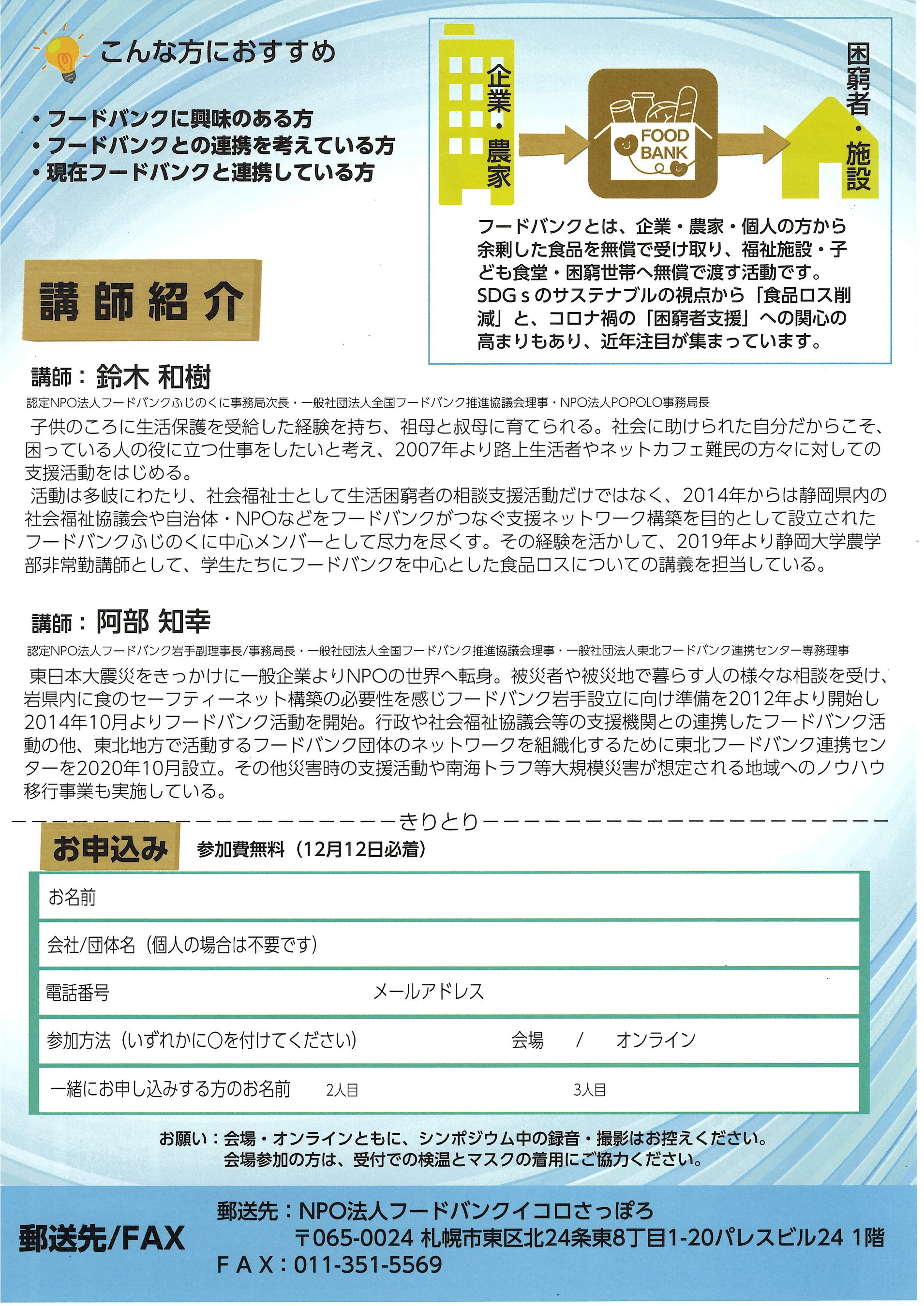 静岡と東北のフードバンクから講師を招き、先進事例から学び、今後の北海道のフードバンクについてディスカッションし、ネットワークで何が変わるのか?を一緒に考えます。