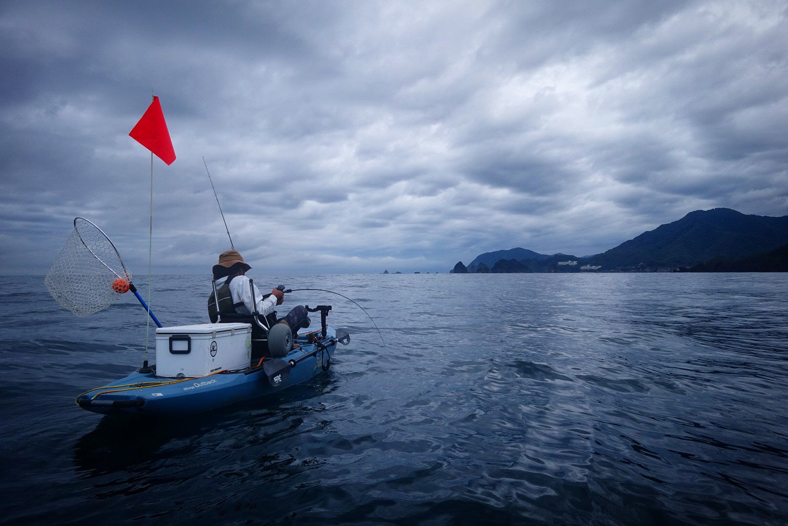 足漕ぎ型のカヤックに乗ることで二酸化炭素を排出しないゼロエミッションを実現した、自然にやさしい釣り体験。エンジンなしで静かな海をゆっくり漕ぎ進むため、釣り以外にウミガメなど海洋生物の観察も楽しめる。山から海への「繋がり」が実感できるアクティビティ。
