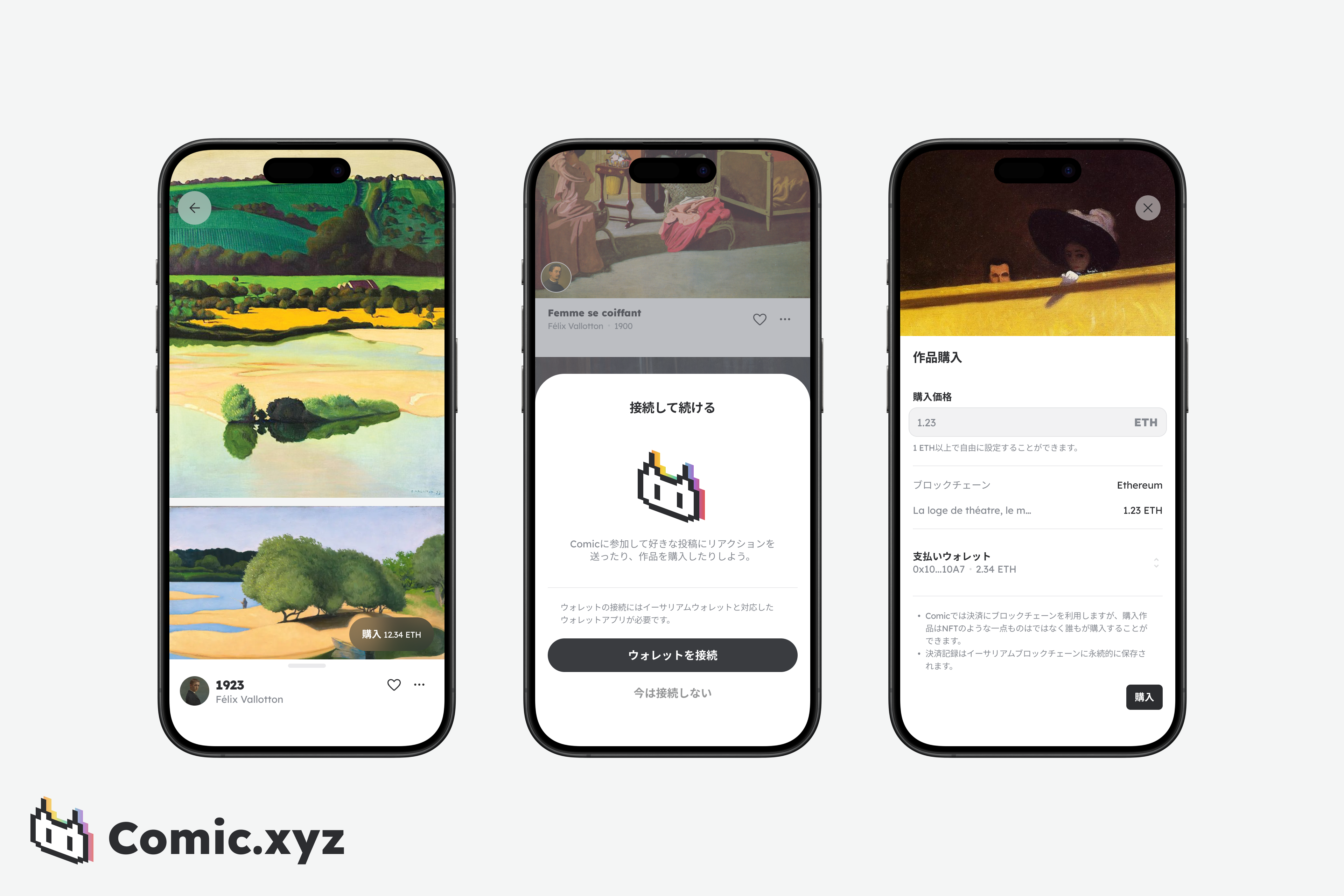 ComicはWeb3技術をベースにしたサービスです。イーサリアムウォレットを接続してログインを行い、イーサリアムの暗号通貨であるETHを決済に利用します。世界共通のオープンな通貨によって、クリエイターの表現を尊重しながら決済を行うことができ、さまざまな国のファンに作品を届けることが可能になります。