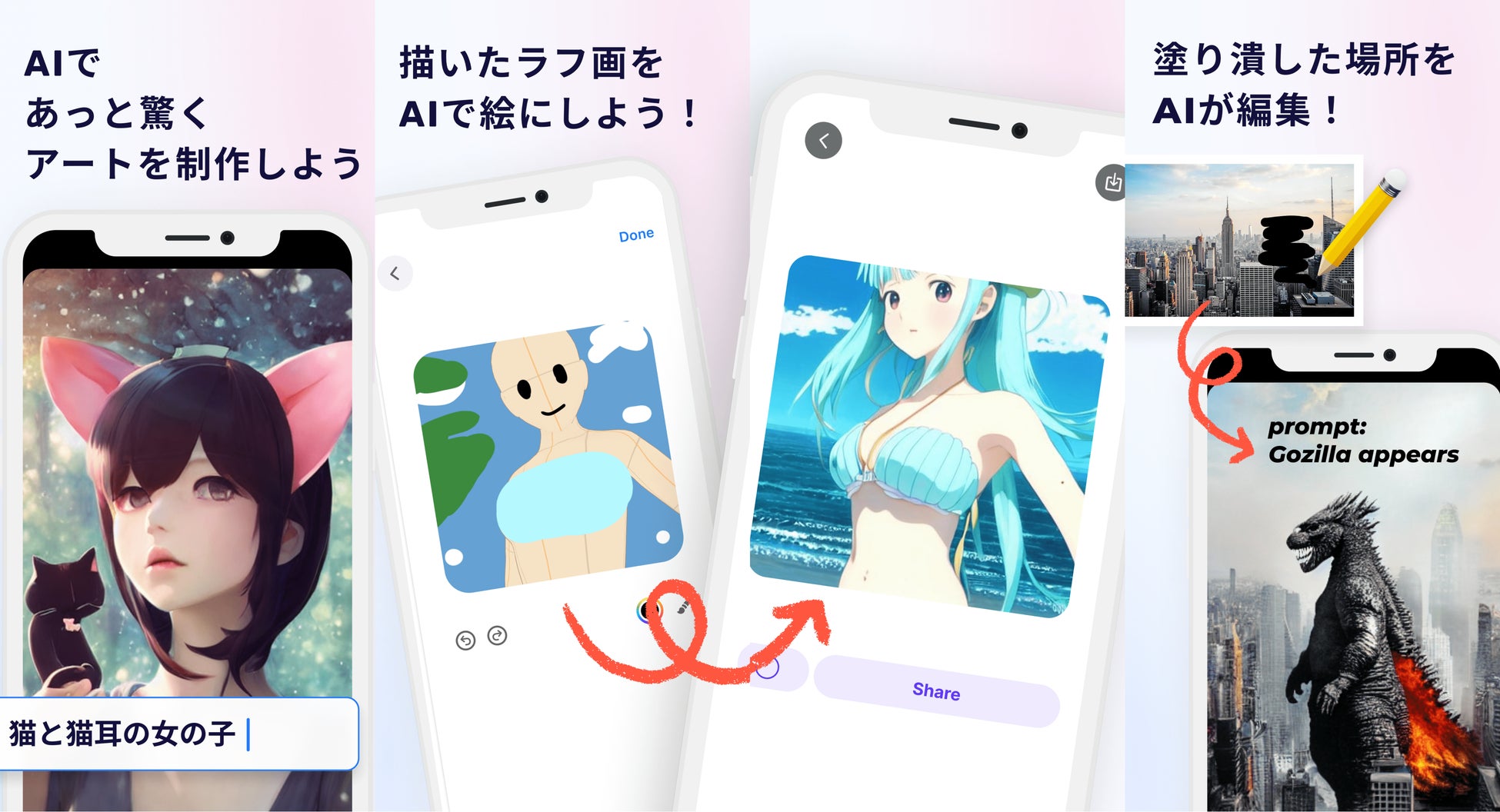 「AIピカソ」は、テキストや簡単な下絵から画像を生成できるAIお絵描きアプリです。「猫と猫耳の女の子」「富士山。浮世絵。」のような簡単な説明を入力するだけで、画像を生成できます。そのほかに、画像の一部を塗りつぶして、その部分をAIに描かせたり、簡単なラフ画(下絵)を描いて続きをAIに描かせることもできます。