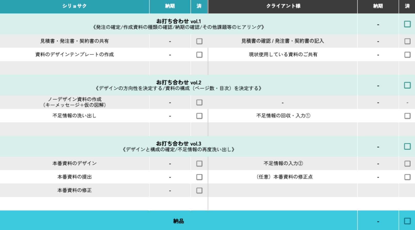 制作は、数回にわたるMTGを経て進行します。時にはお客さまに情報の提供を依頼したり、ことばを考えていただくこともありますが、フローを整備して最低限の負担にとどめています。