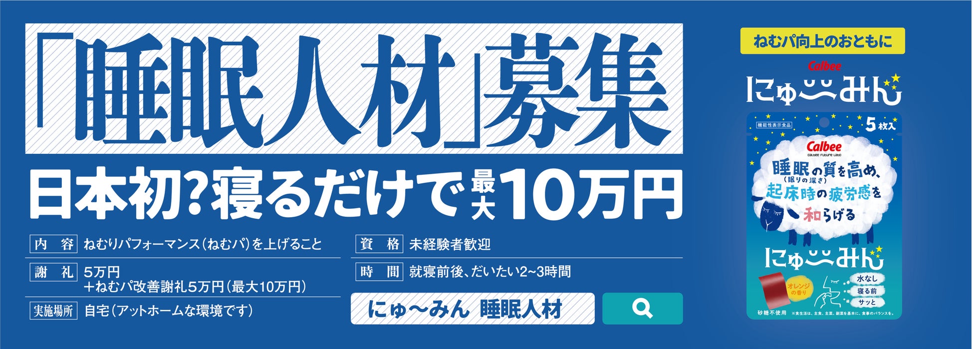 カルビー株式会社(本社:東京都千代田区、代表取締役社長:伊藤 秀二、以下カルビー)は、多忙な現代人に自分の睡眠と向き合ってもらうため、日本初?の「睡眠人材」の募集を2022年12月9日(金)から開始します。採用された方には、自社の睡眠サポート食品『にゅ~みん』を提供するほか、睡眠領域の専門家・柳沢正史教授監修の「ねむりパフォーマンス向上プログラム」を受けていただきます。規則正しい生活を心がけ、睡眠のパフォーマンスを高めていただきます。