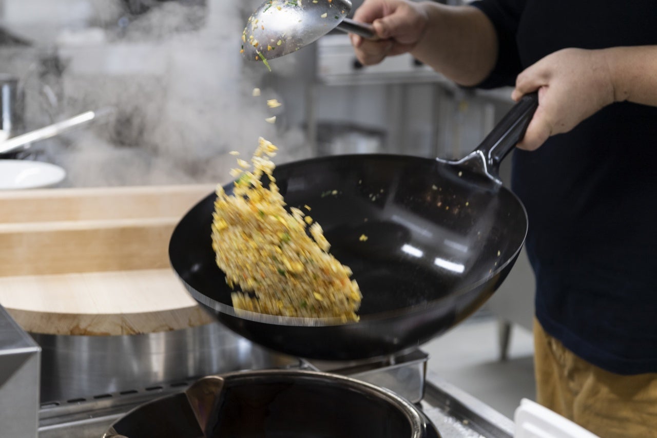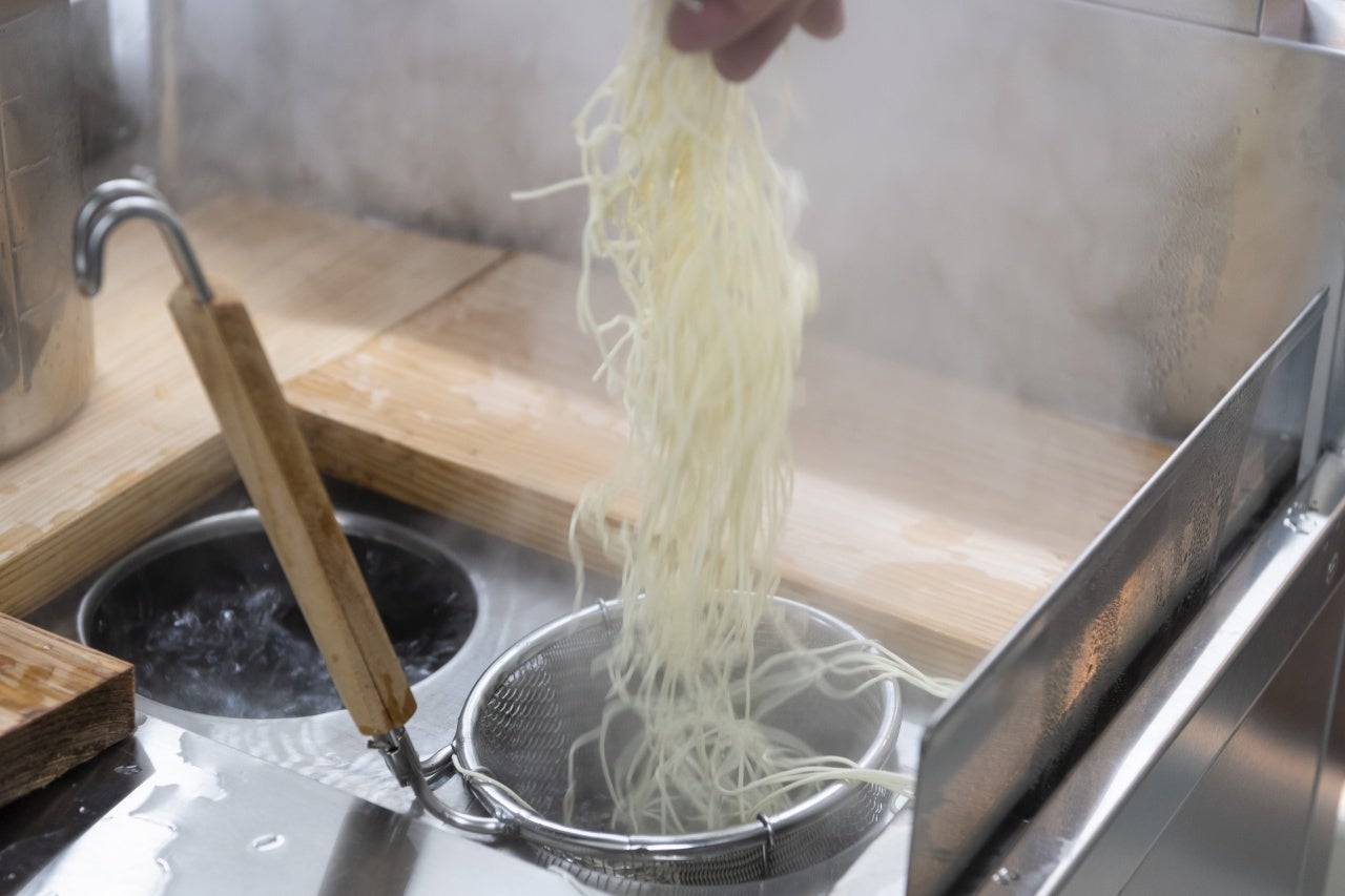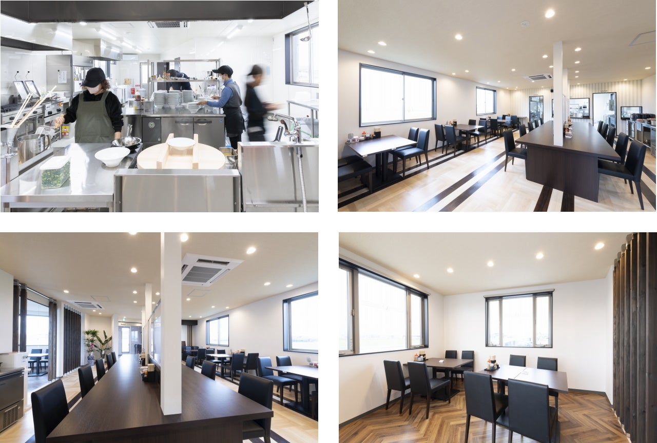 窓ガラスを多く設けた、開放感あふれる店内は、木の温もりを持ちつつもモダンでスタイリッシュ。既存のラーメン店にありがちなデザインから抜け出して、パスタが出てきても違和感がないような明るく、大きな空間を意識しました。いわば“ラーメンのファミリーレストラン”のような空間に仕上げています。広々とした厨房は白を基調とし、清潔感に満ちた空間にしました。また、トイレも男女別するなど、隅々にいたるまで“快適さ”を追求した店づくりを行いました。もちろん、新型コロナウィルス感染対策は万全です。