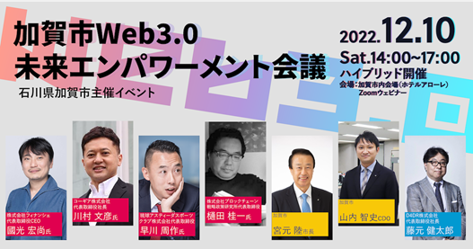 実証実験に関連して、12月10日(土)に開催予定の「加賀市Web3.0未来エンパワーメント会議〜バックキャスティングでありたい未来をエンパワーメント〜」というイベントに、川村がパネリストとして登壇します。アーカイブは後日視聴可能で、当日参加も可能です。詳細はウェブサイトをご確認ください。