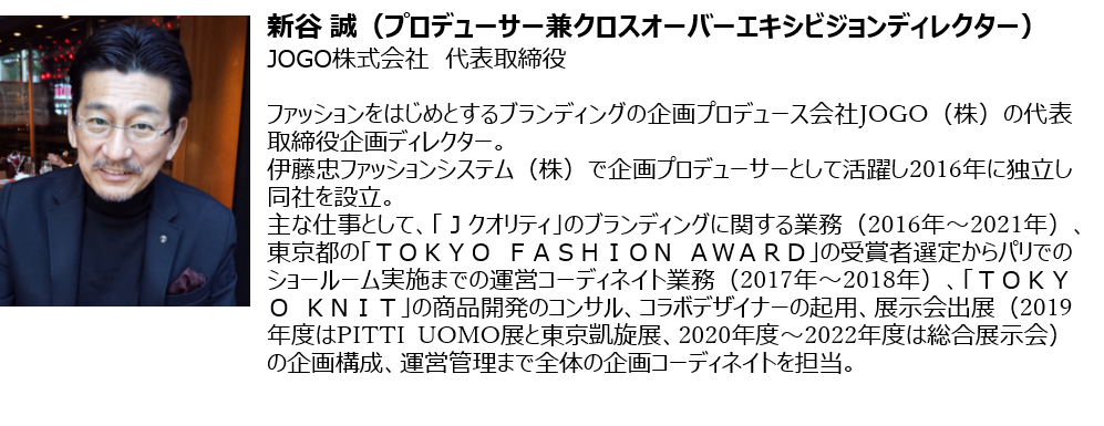 ●クロスオーバーエキシビション(2023年2月21日~23日)で2020年にPITTI UOMOに出展した時の展示方式を踏襲して、1点ずつ説明パネル付きで約24点をフェイスアウト展示する予定。