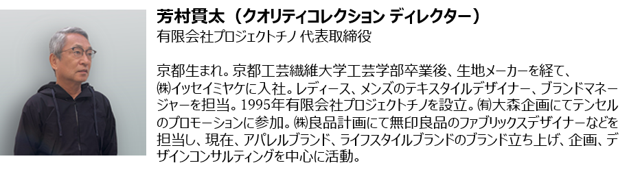 ●芳村貫太氏をディレクターとし、サステナビリティをテーマに参加認証企業の品質や技術を導き出し、同アイテム(フード付きパーカーもしくは⻑袖Tシャツ)で開発。カラーは生成りからグレートーンで表現。