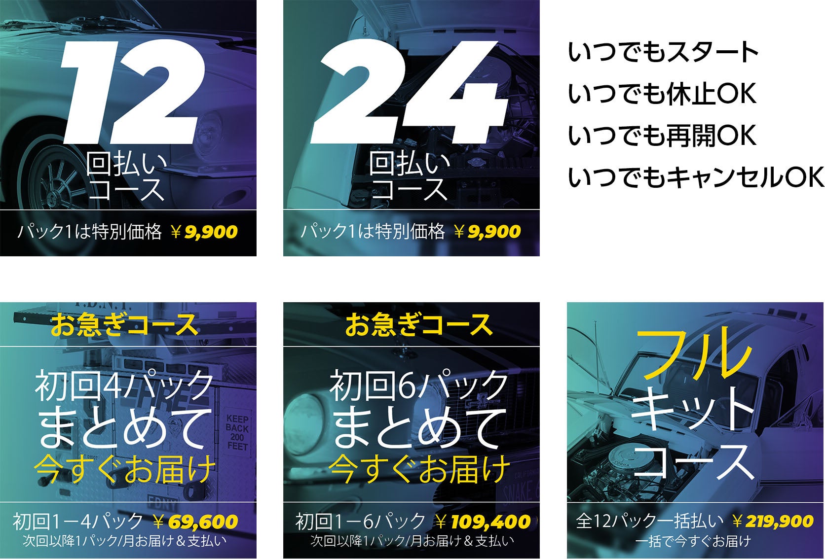 12回払いコース;毎月1回の支払いとお届け。初回特別価格¥9,900。その後は毎月¥19,900(税・送料込)