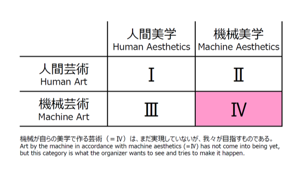 美学を、人間のそれと機械のそれに分ける。芸術を、人間のそれと機械のそれに分ける(図)。そうして生じた4つの部門のうち、機械、または未来のAIが自らの美学と美意識で芸術創作する「機械美学/機械芸術」(Ⅳ)は、われわれ人類にとっては脅威かもしれないが、驚異でもあるだろう。