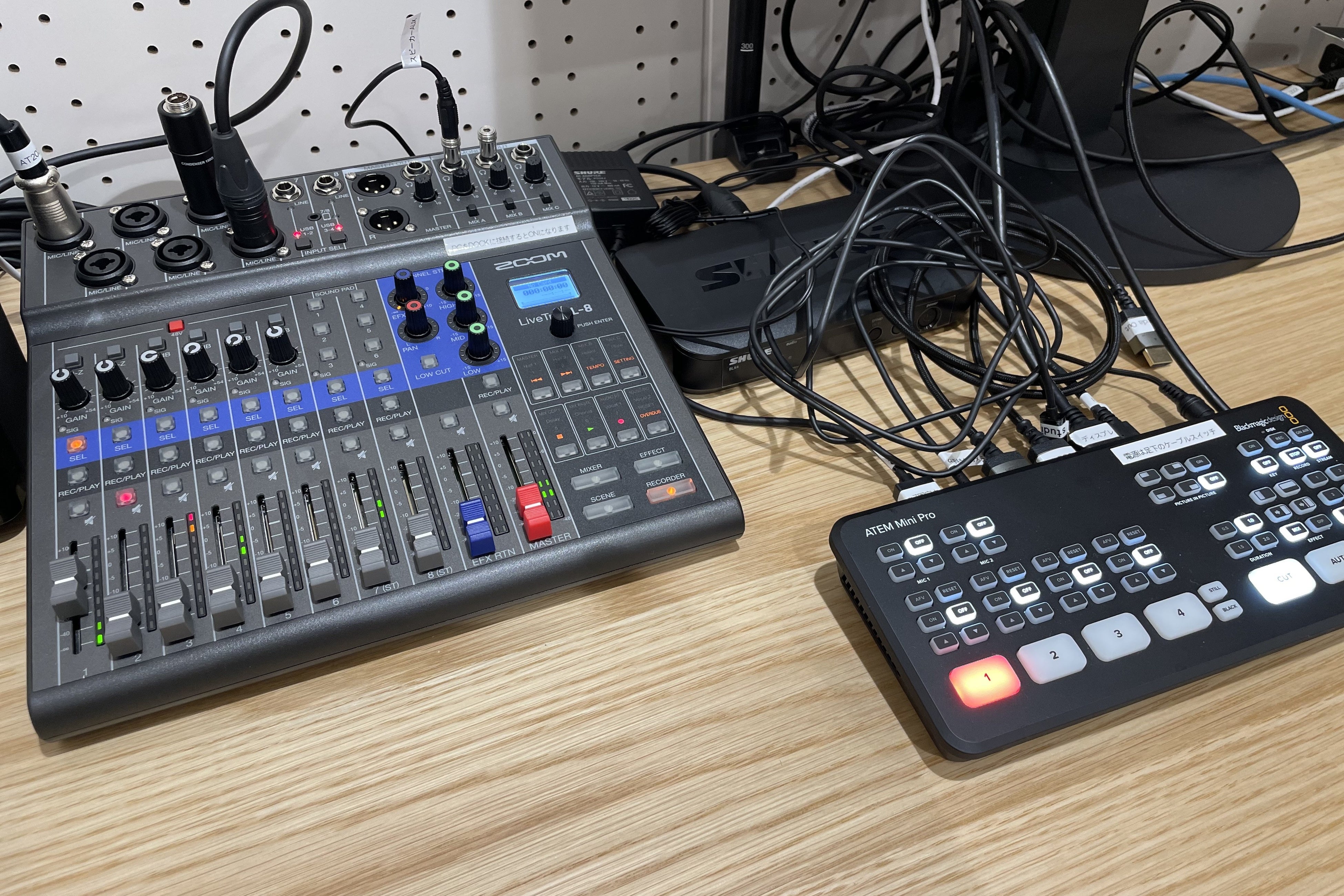 デジタル一眼カメラ(ソニーα7Ⅳ)/デジタル一眼カメラ(ソニー VOLGCAMZV-E10L)/配信用ストリーミングスイッチャー(Blackmagic ATEM Mini Pro)/ウェブキャスティングミキサー(ZOOM LiveTalk L-8)/コンデンサーマイク(AT2020)/ 4K対応27インチモニター(EIZO ColorEdge CS2740 )/マルチメディアスピーカー (CREATIVET60)/LEDスタジオライト(Godox SL15 (2台))/背景用クロマキーなど