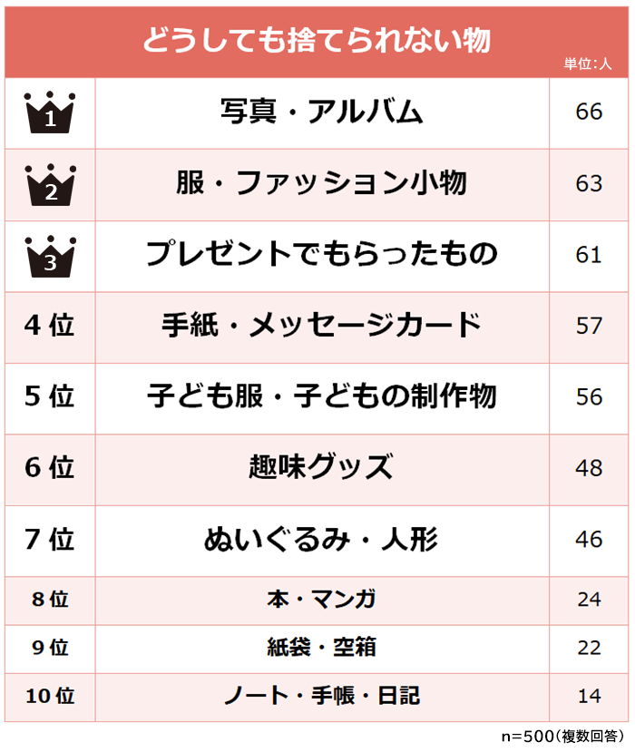 写真やプレゼントなど、「誰かとの思い出を感じるもの」を捨てにくいと感じる人が多いとわかります。
