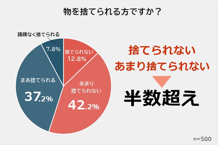 男女500人に「あなたは物を捨てられる方ですか?」と聞いたところ、「捨てられない」「あまり捨てられない」と答えた人が合わせて55.0%で、半数を超えました。