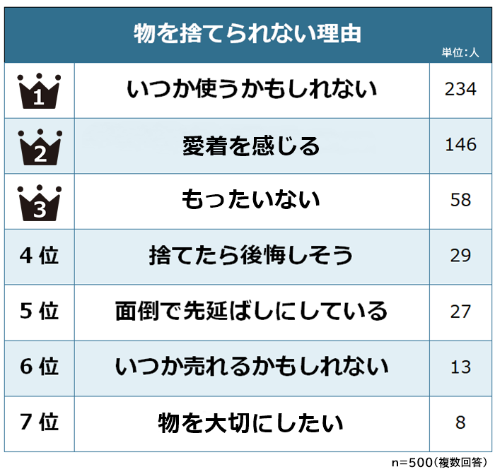 「物を捨てられない理由」を聞いたところ、1位は「いつか使うかもしれない(234人)」でした。