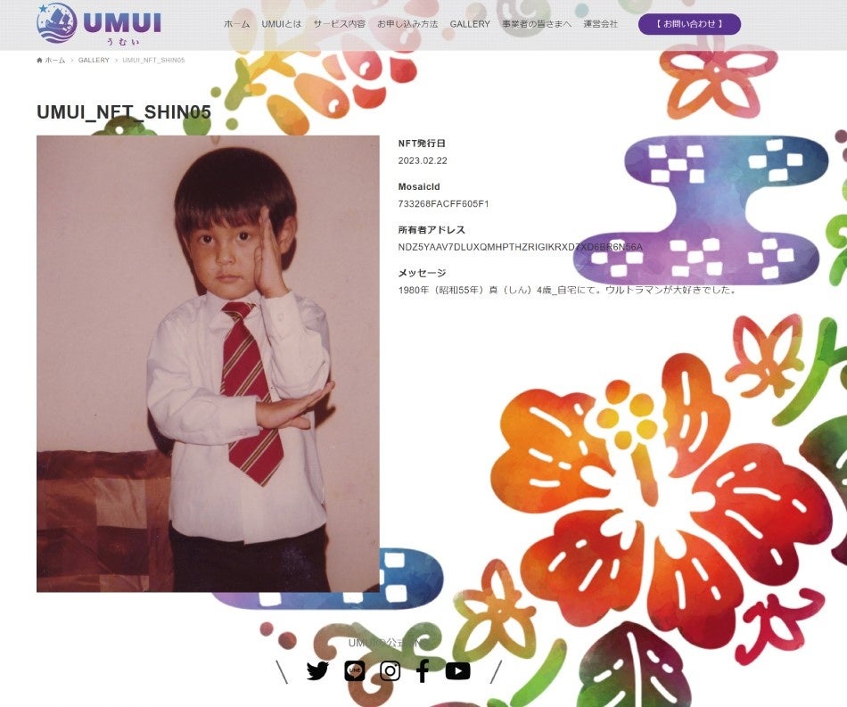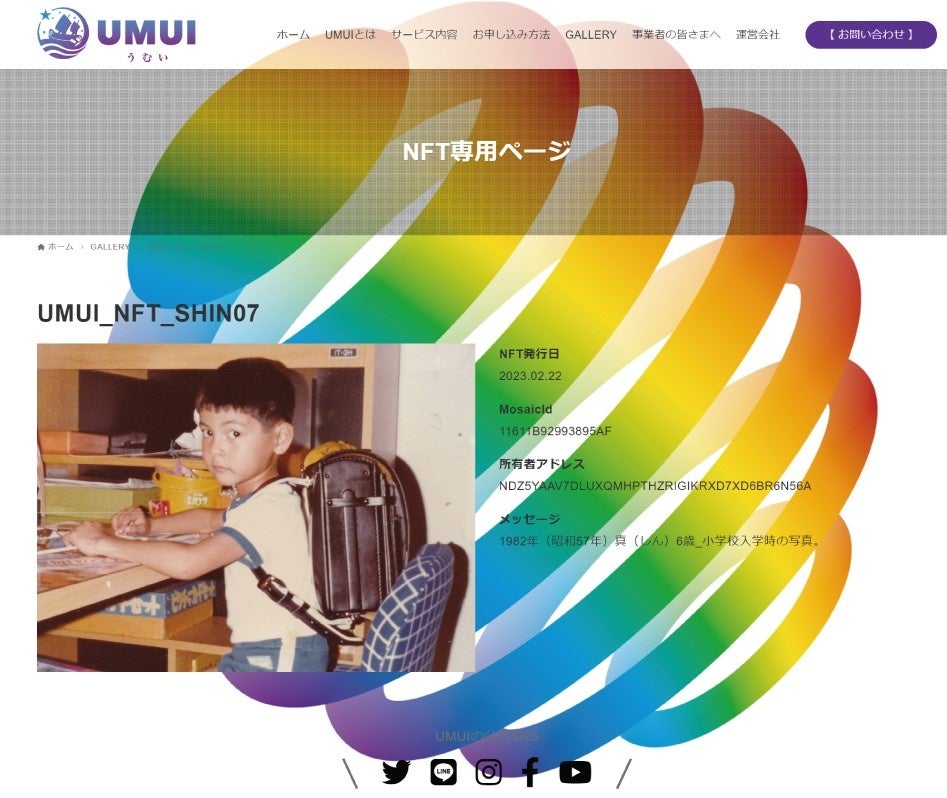 『UMUI~うむい~』の本サイトでは、お客様が大切に残したい写真や動画、音声ファイルなどを、絶対に消すことのできないフルオンチェーンNFTとして保存するサービスです。NFTDriveという特許申請中のシステムを活用して、画像データなどをSymbolブロックチェーン上に直接保存する技術です。