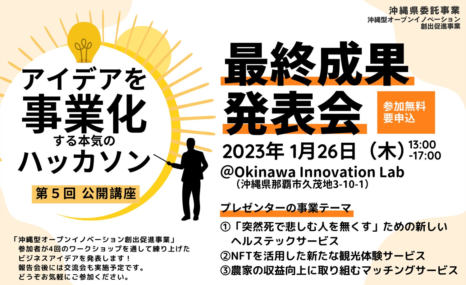去った、2023年1月26日(木)に、運営会社の合同会社パレットリンク沖縄が参加しておりました、沖縄型オープンイノベーション創出促進事業の「アイデアを事業化する本気のハッカソン」最終成果発表会にて、『UMUI~うむい~プロジェクト』を一部ご紹介いたしました。
