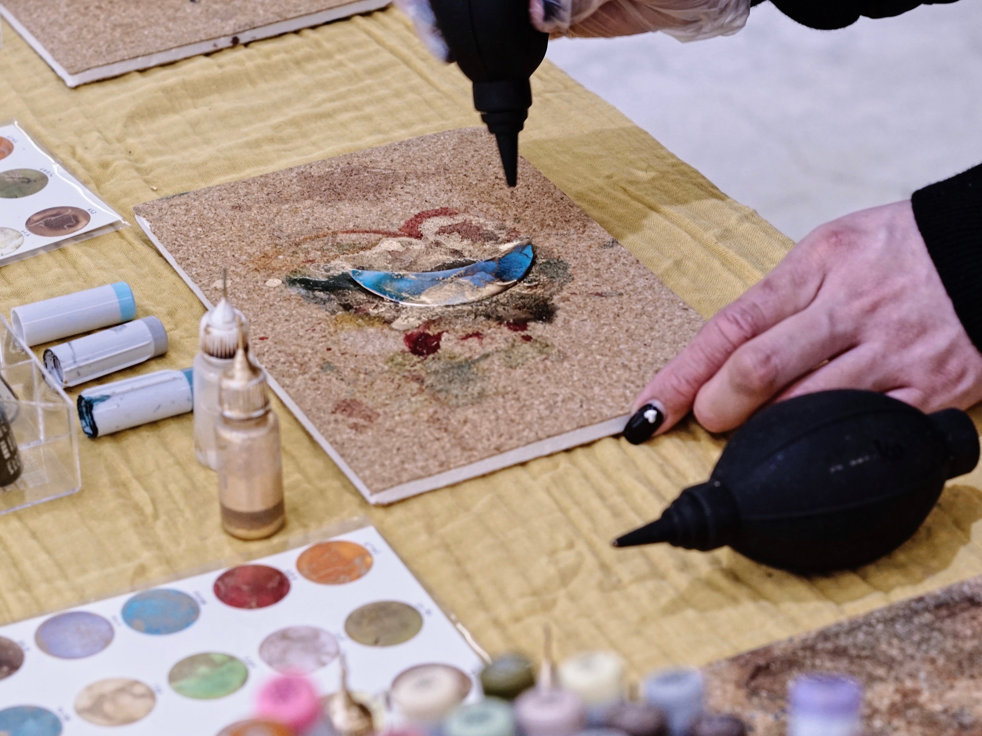 アルコールを飛ばして描くアートなので、すぐに乾き完成捨のでその場でお持ち帰りいただけます。