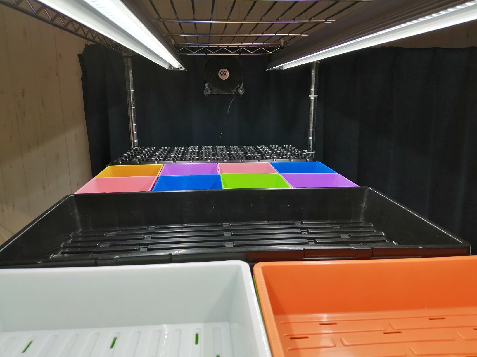 ・LED留意点:マイクログリーン栽培に使用している植物栽培仕様LEDは太陽光色に近く、小さな葉物野菜を育てるのに適した設計を施しています。花芽や果実を栽培する仕様にはなっていません。光源から野菜までの指定距離を保った設置が効果的な光源(光子量)を与えることができるように設計されています。また、LED光源には雑菌を抑制する効果があるとの研究報告もあります。勿論、LEDですから電力消費量も軽減され、LED機材の熱は一般の蛍光灯ほど高熱にはならず野菜の葉焼けなどはおきません。(自社仕様を委託製造しています。)