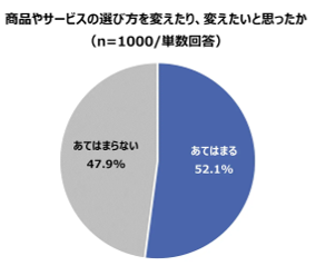 昨今、新型コロナや物価高騰などの背景により、自らのライフスタイルに適した商品やサービスへと見直しを行う「換え活®」が注目を集め、多くの人が実践しています。実際に株式会社タイムカレントが実施した調査では、2人に1人が自身の消費行動の選び方を変えたり、変えようとする意向が見られました※。