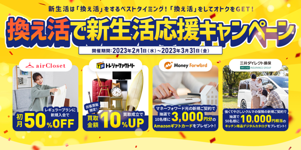 「換え活®」推進委員会は、2023年2月1日(水)より、期間限定で『換え活で新生活応援キャンペーン』を実施いたします。本キャンペーンでは、「換え活®」に賛同する4つの企業とコラボし、値上げラッシュが続くこの春に、新生活を応援する特別なプランを提供いたします。
