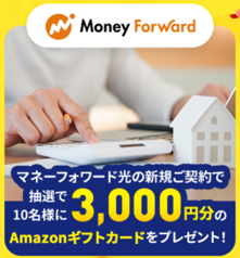 | 特典内容 | 『マネーフォワード光』の新規ご契約で抽選で10名様に、3,000円分Amazonギフトカードをプレゼント ※エントリー期間中に対象ユーザーがマネーフォワード光に仮申込をし、別途専用Googleフォームからエントリー、2/1〜4/30までに開通が完了している場合 |
