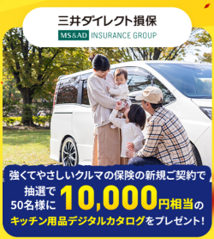 | 特典内容 | 「強くてやさしいクルマの保険」の新規ご契約で抽選で50名様に、10,000円相当のキッチン用品デジタルカタログをプレゼント |