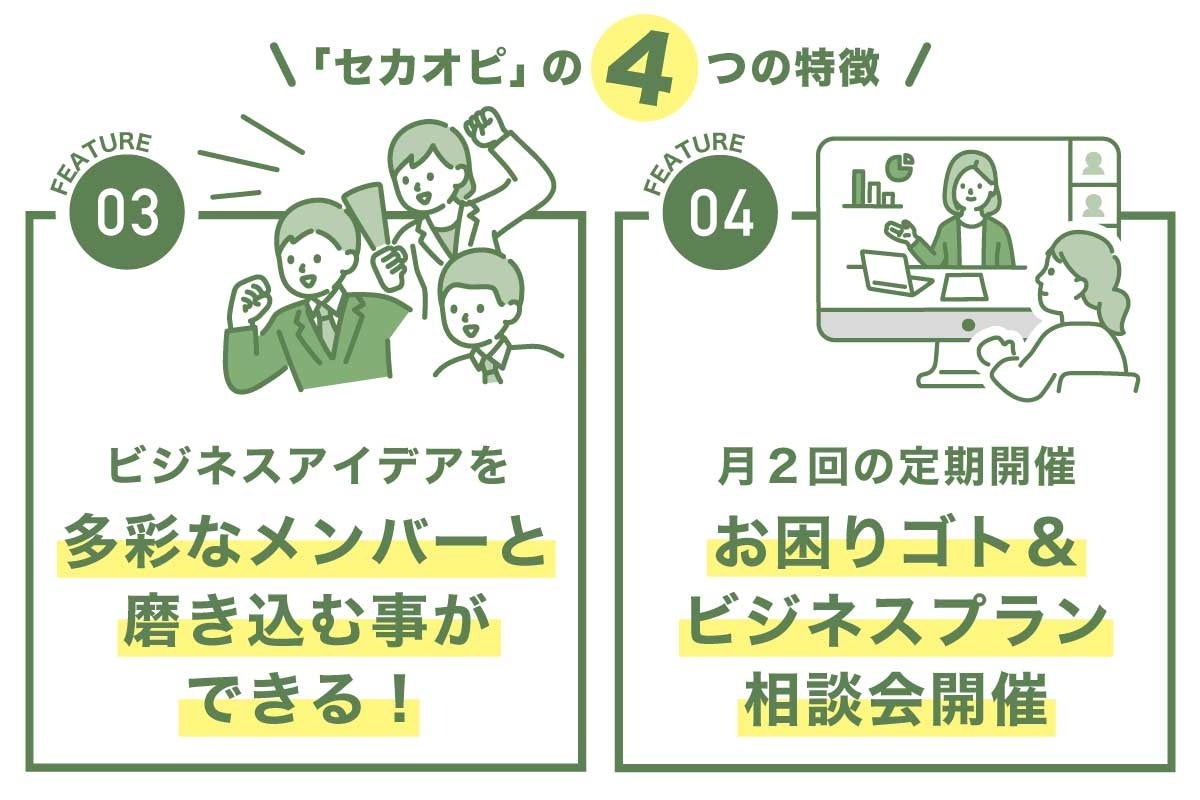 これから起業する、起業したけど悩みを相談できる場所がない等のお悩みゴトを一緒に学び、解決できる仲間やアドバイザーと出会えることが「セカオピ」の特徴です。まだ立ち上がったばかりのオンラインコミュニティ「セカオピ」ではメンバーも募集中!