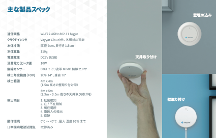 高性能なVayyar社製4Dレーダーセンサーを利用して、転倒検知、活動分析、状況確認、通知など独自ソリューションとして開発。介護施設において導入しやすく、プライバシー等入居者に配慮、家族にも安心な見守りソリューションとして”ヴェスタ”を商品化することとなった。