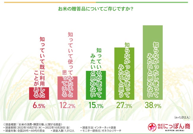 そこで、「お⽶の贈答品についてご存じですか?」と質問したところ、『知っていて既に利⽤したことがある(6.5%)』『知っていて使ってみたいと思っている(12.2%)』『知っているが使ってみたいと思わない(15.1%)』『知らな かったが使ってみたいと思う(27.3%)』『知らなかったし使ってみたいと思わない(38.9%)』という回答結果になりました。